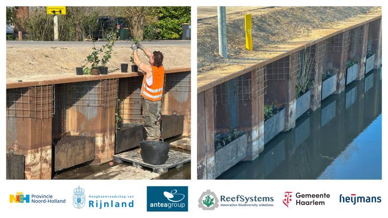 Provincie Noord-Holland, het Hoogheemraadschap van Rijnland, de gemeente Haarlem, Antea Group and Heijmans have joined forces on a big infrastructure maintenance project along the Zuid Schalkwijkerweg. As part of this collaborative effort, new cables and pipelines were installed, and the dike was reinforced to meet the latest safety standards and future climate resilience demands. In addition to these technical upgrades, the project consortium sought to enhance the ecological and visual quality of the area. ReefSystems was invited to contribute by greening the existing sheet pile walls (dam walls) along the canal. The aim was to soften the urban streetscape and simultaneously support local biodiversity and ecosystem restoration. To achieve this, 74 specially designed planters were installed within the sheet pile walls to accommodate wetland vegetation. These planters not only help filter the water flowing through the canal, improving water quality, but they also create breeding grounds and shelter for insects and other small organisms. This transformation turns otherwise lifeless civil infrastructure into thriving micro-ecosystems, contributing to a greener, healthier, and more nature-inclusive city.